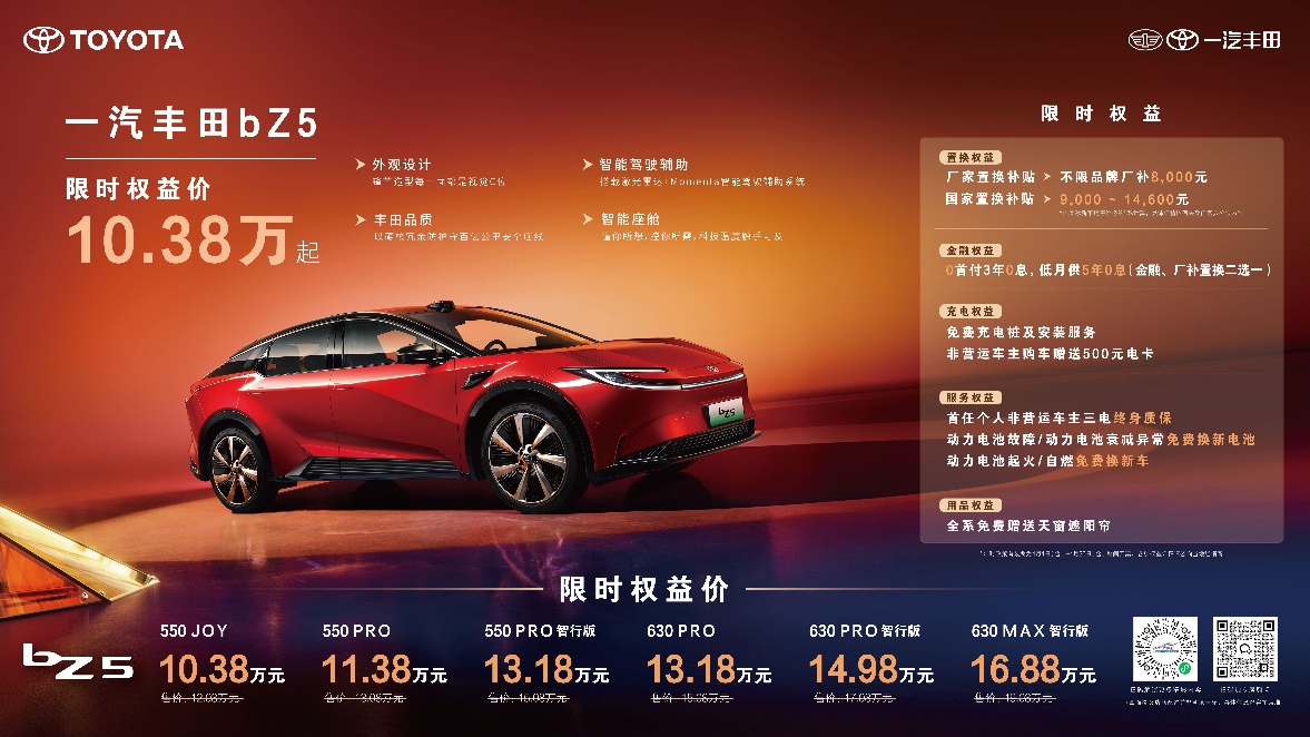纯电车型bZ5在4月推出限时权益加码,置换权益升级为不限品牌厂补8000元,更可叠加9000-14600元的国家置换补贴,550JOY车型叠加厂补及国补后,限时权益价低至10.38万元。金融权益也是诚意满满,0首付3年0息,低月供5年0息,降低购车门槛(置换、金融二选一)。同时匹配免费充电桩、500元电卡、非营运车主三电终身质保及电池三兜底保障政策,为后续用车提供安心保障。4月购车用户还可免费获赠天窗遮阳帘,舒适加倍。